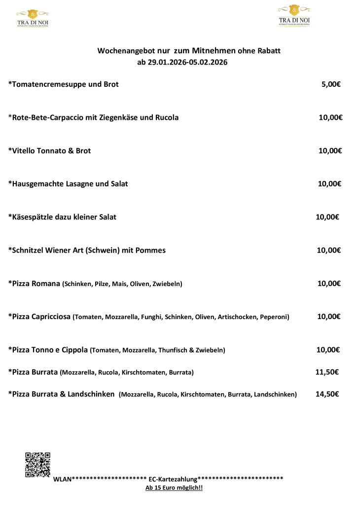 Alle Gerichte unserer kompletten Speisekartegibt es auch zum Mitnehmen. Dafür erhalten Sie 10 % Abholrabatt. Wir freuen uns auf Ihre Bestellung.